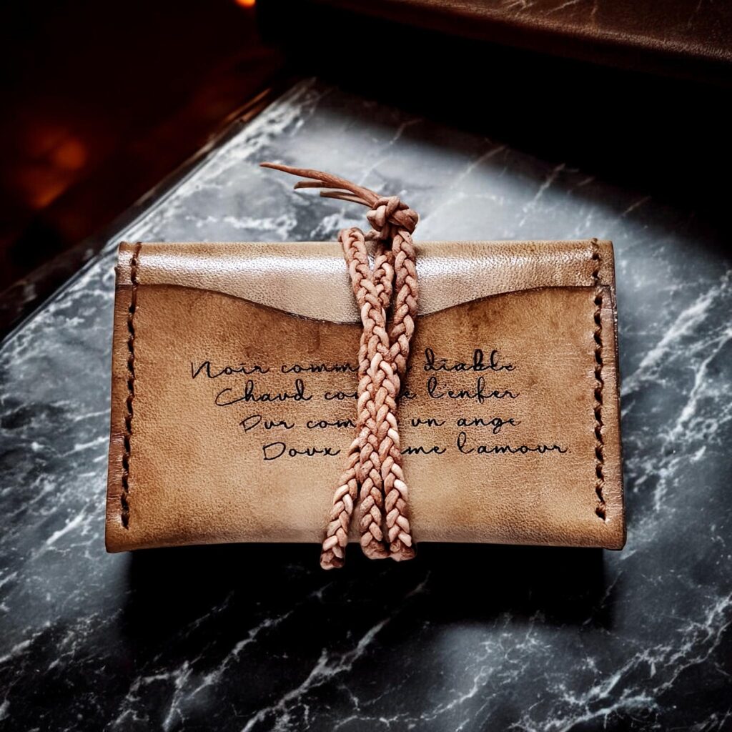 一つ目は革をコーヒーに浸し、その後、コーヒーに纏わる言葉を刻印しました。