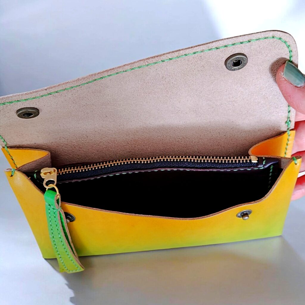 キャメル色の植物タンニン鞣し革と、グラデーション染色をしたタンロー革を使い、内部の取り外せる二つの長財布を作りました。